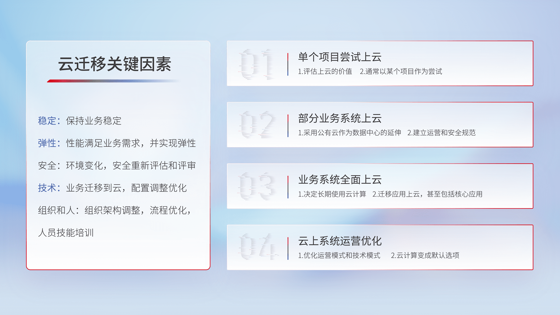 结合实际业务,,,,从规划设计、、、、云平台选型、、、云原生改造、、、、数据迁移、、、集成交付,,迁移全过程为客户识别最佳上云路径,,做好风险识别管理,,,,设计网络架构、、、身份权限、、安全审计合规、、、操作审计、、、日志审计、、、监控告警策略、、多站点容灾设计等,,,对云上基础设施进行整体规划,,,,提升IT治理水平,,以满足弹性、、、、高可用、、、高性能的需求。。。